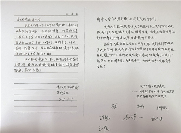 此前,四位同學(xué)已看過奧運(yùn)冠軍在林芝的宣講新聞,能在列車上與冠軍“隔空相遇”,讓他們既驚喜又遺憾。因?qū)嵺`支隊(duì)需趕往下一站開展宣講和志愿活動(dòng),他們沒有時(shí)間與冠軍們當(dāng)面交流。“兩支宣講隊(duì)伍,一個(gè)在學(xué)術(shù)領(lǐng)域刻苦鉆研,一個(gè)在體育賽場(chǎng)上不懈拼搏,我們都在為建設(shè)祖國而奮斗。”實(shí)踐支隊(duì)隊(duì)長(zhǎng)左宏量說。當(dāng)隊(duì)員王珺儀提議寫一封信轉(zhuǎn)交奧運(yùn)冠軍時(shí),大家都為這個(gè)想法感到興奮,迅速著手起草。信中,四位清華學(xué)子寫下了他們的心聲: