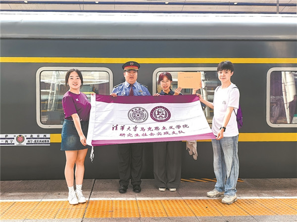 Z22次列車長(zhǎng)司文東在北京西站交付信件后與清華學(xué)子合影。李 磊 攝