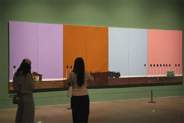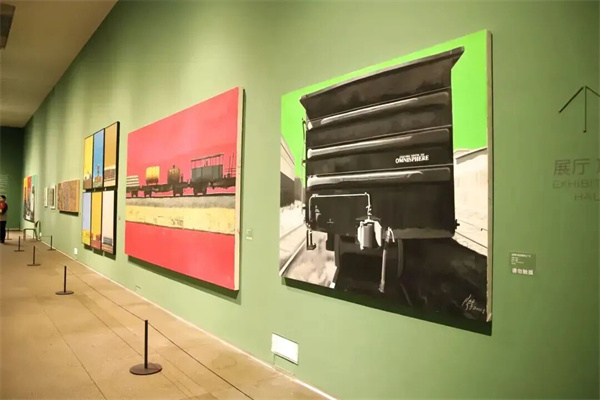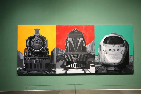 序廳以《奔騰·歲月》開篇,描繪中國(guó)鐵路發(fā)展的重要階段。作品中的機(jī)車主體以黑、白、灰為主色調(diào),盡顯硬朗雄厚的力量感;而背景的紅、黃、綠三種高飽和度純色,則為機(jī)械的冰冷感賦予了強(qiáng)烈的當(dāng)代視覺(jué)沖擊力。觀眾得以從中國(guó)鐵路的巨變中,真切感受到中國(guó)的飛速發(fā)展和時(shí)代變遷。