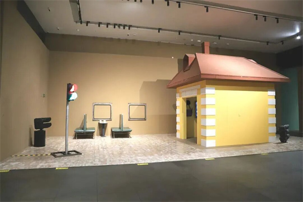 展廳中,一件名為《站臺(tái)》的大型裝置作品尤為引人注目。作品以東北地區(qū)火車扳道房為原型,淺紅褐色屋頂與赭石色墻體復(fù)刻了工業(yè)記憶,地面如白雪覆蓋,搭配綠皮火車座椅、茶幾與模擬車窗,再輔以信號(hào)燈的光影點(diǎn)綴,讓每一位觀眾都能成為這段旅途中的風(fēng)景,完美詮釋了“場(chǎng)域性景觀”的藝術(shù)構(gòu)想。